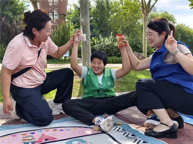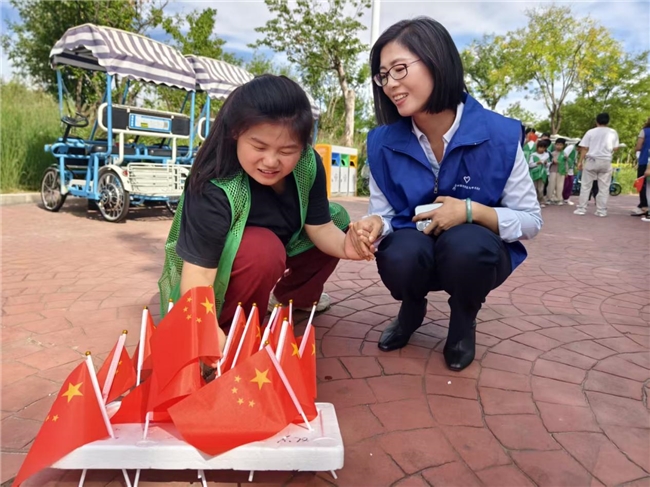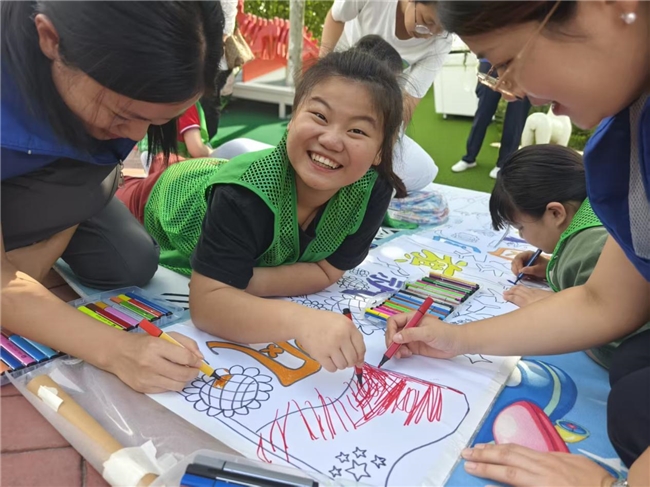 活动现场暖意融融,志愿者们与天津蒙恩教育康复中心的老师们一起提前布置场地,准备了色彩鲜艳的绘画工具、月饼与鲜红的小国旗,为孩子们营造出温馨的节日氛围。整场活动围绕“双节”双节设计,三个互动环节层层递进:在“抢月饼”游戏中,志愿者与孩子们结对组队,随着欢快的音乐相互配合,在追逐与欢笑中拉近彼此距离;“绘中秋画”环节里,孩子们用画笔勾勒月亮、玉兔与向日葵,志愿者则在旁耐心引导,帮助他们将心中的节日景象化作斑斓画作;“插国旗”环节最是令人动容,志愿者与孩子们比赛插放小国旗,当一面面五星红旗在小板子上竖起,孩子们眼中闪烁着好奇与自豪,爱国情怀与节日喜悦在这一刻悄然传递。