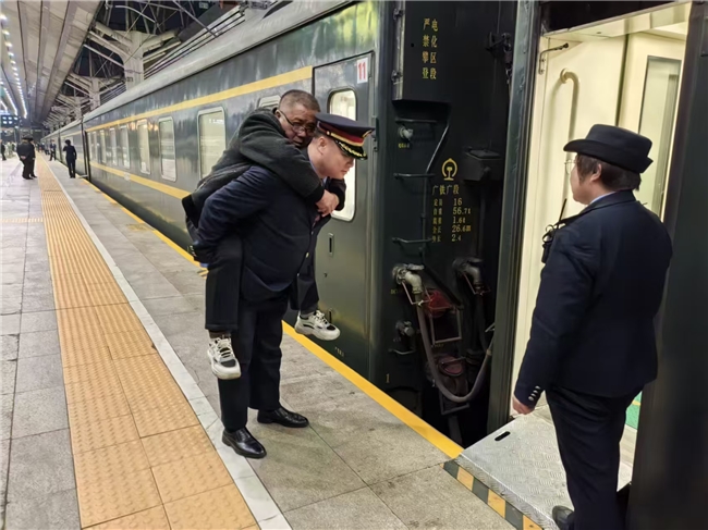 彼时正在列车中部11号车厢外值守的京广十二组列车长陶龙,目光敏锐地发现15号车厢附近,老年旅客唐基明正步履蹒跚地挪动脚步,腿脚显得格外无力。他当即快步跑至旅客身边,在确认唐基明是Z501次列车的乘车旅客后,得知其刚做完腰部手术、行动极为不便,陶龙没有丝毫犹豫,俯身背起旅客,稳稳穿过车厢通道,将他安全送到座位。考虑到旅客术后需卧床休息,陶龙又主动协调,为其调整到更为方便的下铺,细致叮嘱周边旅客多留意关照。