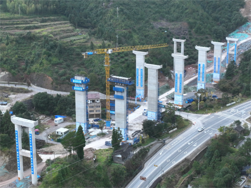 攻坚克难,科技赋能破难点。苍泰高速10标段全长15.899公里,桥梁隧道占比高达83%,大溪源特大桥、察溪大桥、下彩隧道等高墩大跨、特长隧道工程是制约进度的“硬骨头”。为实现控制性工程突破,项目部集中优势资源与精干力量,联合多方力量组建联合技术攻关小组,成功研发《强风化破碎岩体带浅埋隧道机械化施工工法》(认证为河南省工程建设省级工法)、《灌注桩后压浆管路及压浆装置》(获评为中国建筑第七工程局有限公司小发明类特等奖)等多项技术成果。隧道开挖作业中,全面采用凿岩台车等先进机械,并依托实时监测数据动态优化爆破参数,在显著提升单循环进尺效率与炮孔残留率的同时,有效控制超欠挖现象,引入二衬台车智能防偏移系统,通过自动化纠偏与精准定位,有力保障衬砌结构的表观质量与整体性。桥梁工程方面,针对空心薄壁墩的施工特点,应用爬模技术,在加快墩身浇筑进度的同时,极大降低了高空作业安全风险,实现了效率与安全的统一。项目持续加大大型专用设备的资源投入,包括塔吊、隧道开挖台车、二衬台车等,形成了连贯、高效的机械化流水作业线,为现场施工的稳步快速推进提供了坚实支撑。