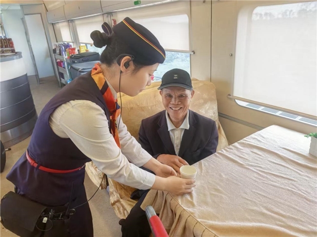 “老人家,您先在这里休息,有什么需要随时告诉我们。”苏虹伊帮老人安置好行李,又为他端来一杯温水。旅途中,她时刻惦记着这位特殊的旅客,每隔一段时间就会来到餐车,看看老人是否需要帮助。她细心观察老人的状态,及时添加热水,在老人需要去洗手间时小心搀扶。这些细致的照顾,让原本面露忧色的老人渐渐放松下来。