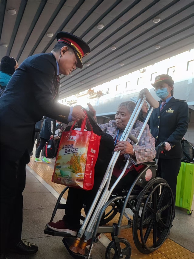 人民交通讯(韩杨)2025年11月24日,由广州客运段京广车队京五组担当的Z296次列车停靠长沙站,正在站台上忙碌组织旅客乘降的列车长时刚强,在硬座16号车厢外敏锐地注意到了一位特殊旅客——一位拄双拐杖、神情略显不便的老人。时车长立即快步上前,俯身耐心询问情况。经了解,这位姓胡的老人年逾80岁来自衡阳,是一位腿部残疾人士,当日独自乘车前往北京,正准备乘坐本次列车去毛主席纪念堂瞻仰伟人。他立即上前接手,将老人小心搀扶至车厢安顿好,随即向列车员交代:“务必全程关注,轮流照看,确保老人旅途顺利。”