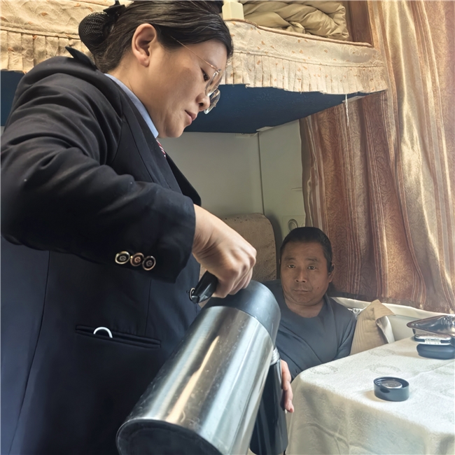 随着列车轰鸣前行,列车长特别委托软卧车厢的乘务员张倩,给予赵先生无微不至的关怀。张倩以实际行动诠释了“服务至上”的真谛,她不时轻声询问赵先生的需求,适时递上一杯温热的茶水,每一个细节都透露出铁路人那份质朴而深沉的责任感。“看到旅客有需要,伸出援手、细心照料,这是我们义不容辞的责任。”张倩的话语,如同冬日里的一缕暖阳,温暖了人心。