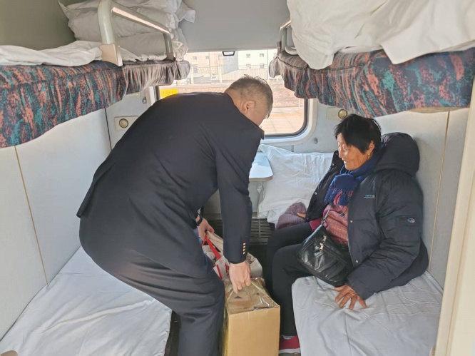 李彪一边表示全力提供帮助,一边通知列车值班员预留好铺位,安排乘务员周楠在车门处等候。列车在商丘南停稳后,李彪与周楠一起搀扶老人上车,并将老人安置在预留好的下铺席位。