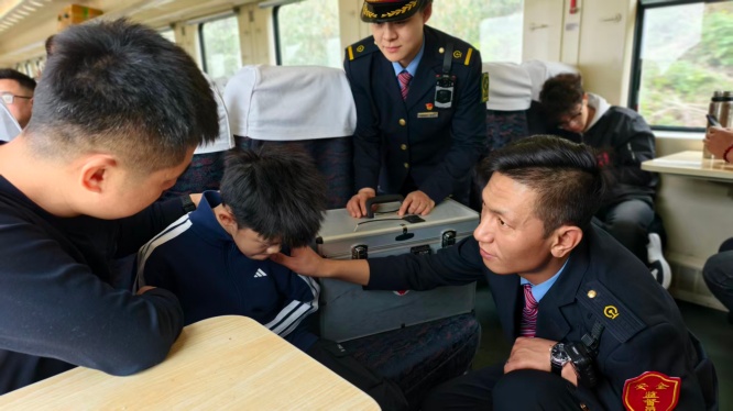 情况紧急!列车长张宗玉、19号车厢乘务员阚春贵立即通过列车广播寻医,同时取来列车医药箱备用。在同车医务工作者的指导协助下,工作人员为孩子规范服用止泻药物,孩子不适症状逐步缓解。途中,列车长张宗玉、列车员陈新全程悉心照料,定时查看状态、悉心陪护安抚,直至列车抵达广州白云站前,孩子已完全康复。