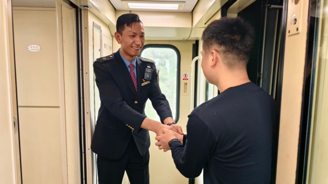 临下车时,李先生紧紧握住乘务人员的手,激动地说:“铁路工作人员就像家人一样,让我特别感动,在车上和在家里没区别,太亲民、太感谢了!”