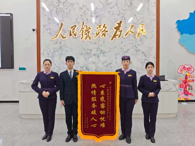 几天后,一面印有 “心系乘客排忧难,热情服务暖人心” 的锦旗被送到了G1215次列车所属的沈阳客运段动车三队。