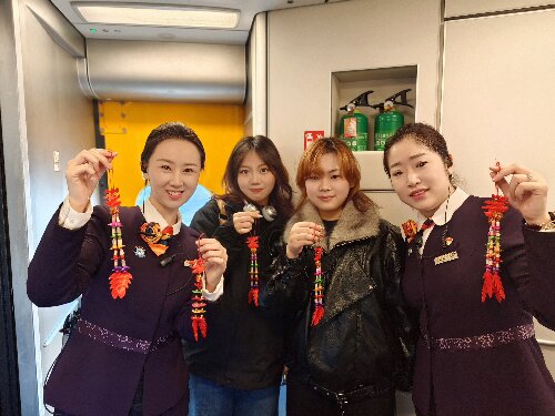 列车内,喜庆的窗花让旅客一上车就感受到非遗文化的魅力。列车员为旅客赠送“龙凤尾”时,还详细介绍其制作工艺、佩戴习俗,讲解“庄河二月二”民俗的历史与传承,同时普及乘车安全注意事项,让旅客旅途安心又暖心。