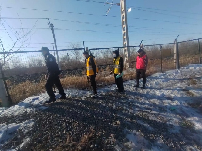 图为:龙江站派出所民警同铁路护路人员进行线路巡查工作