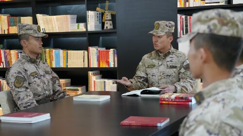 图为官兵互相交流学习党的二十届四中全会精神心得