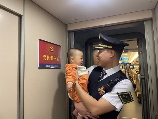 正当她焦急之时,列车长李志鹏及时发现了这一情况。他快步上前,温和而坚定地对张女士说:“您别急,孩子先交给我,请放心!”说着,他小心地从张女士怀中接过仍在哭闹的孩子。