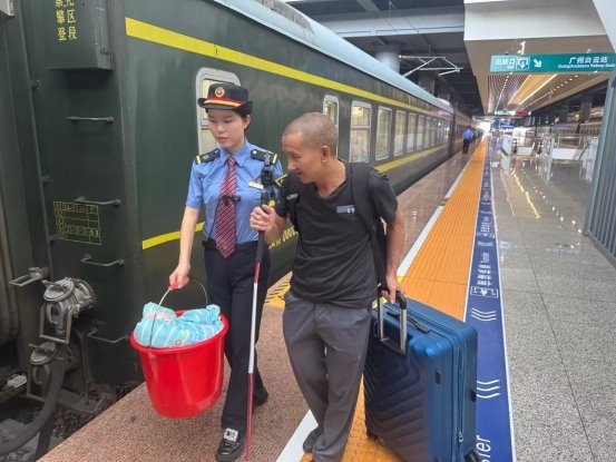 人民交通讯(韩杨)近日,由广州东线二队值乘的T152次列车自广州白云站缓缓启程。列车长贺珊珊在站台巡视时,发现一名手持白色拐杖、独自候车的盲人旅客。
