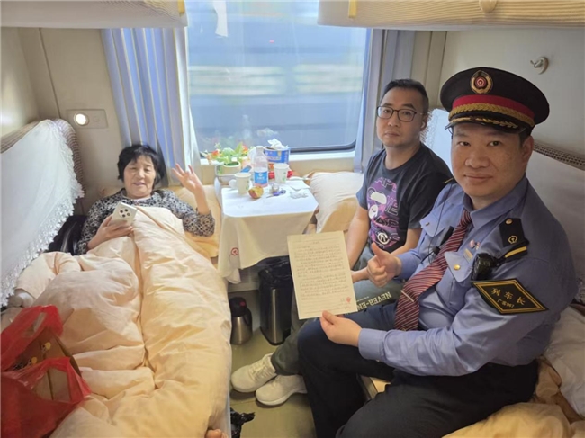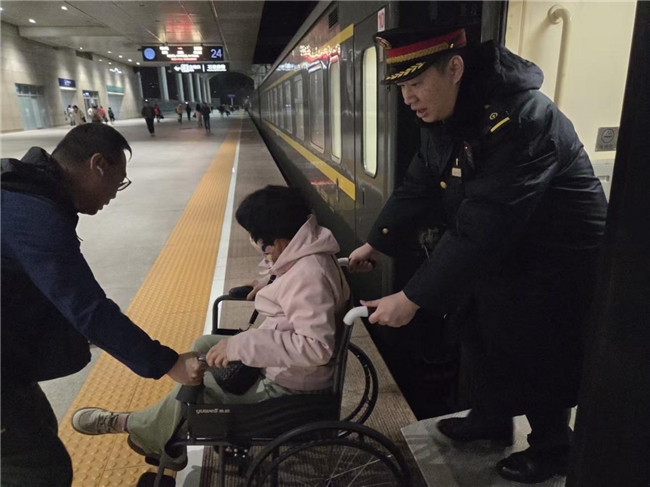 服务并未就此止步。这趟列车要从海南开往河北石家庄,行程近三十小时。陈剑辉提前联系石家庄站,详细说明了旅客情况,请车站准备好小轮椅接站。这场跨越千里的爱心接力,在细致的安排下顺畅衔接。