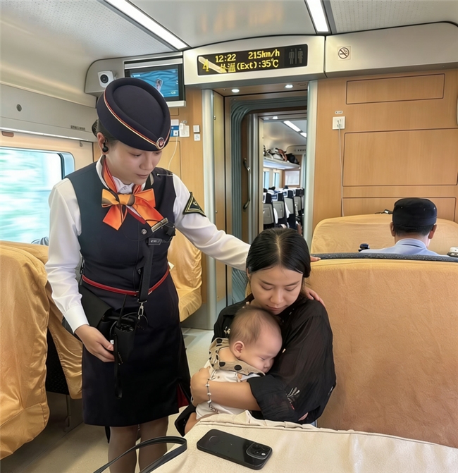 列车缓缓驶出广州南站,一位年轻母亲却面露难色。她独自抱着襁褓中的婴儿乘车,孩子因旅途不适哭闹不停,母亲既要哄娃又要打理行李,一时间手忙脚乱。正在车厢巡视的列车长邱译萱发现这一情况后,立即上前关切询问。