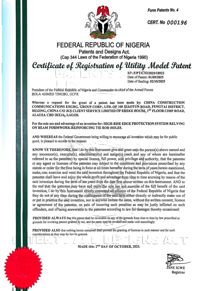 人民交通讯(韩杨)近日,中建交通四川公司自主研发的《一种依托梁模板加固对拉螺杆孔的高层临边防护系统》发明专利,成功获得尼日利亚联邦共和国专利局授权。这是公司首个海外专利,标志着企业在工程技术创新与知识产权国际化布局上实现“从零到一”的关键跨越。