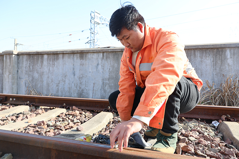 这是一份对细节要求极高的工作。钢轨表面看起来光滑如新,但内部结构是否健康,要靠仪器识别,更靠人来判断。一次在检查一组道岔时,他在波形中察觉到微弱异常,立刻蹲下身,从工具包里取出小镜子观察轨底盲区,再换上不同角度的探头反复探查。边扫查,他还边耐心向身边的新工友解释信号变化的可能原因。最终,他确认:翼轨存在核伤。如果稍有疏漏,后果不堪设想。