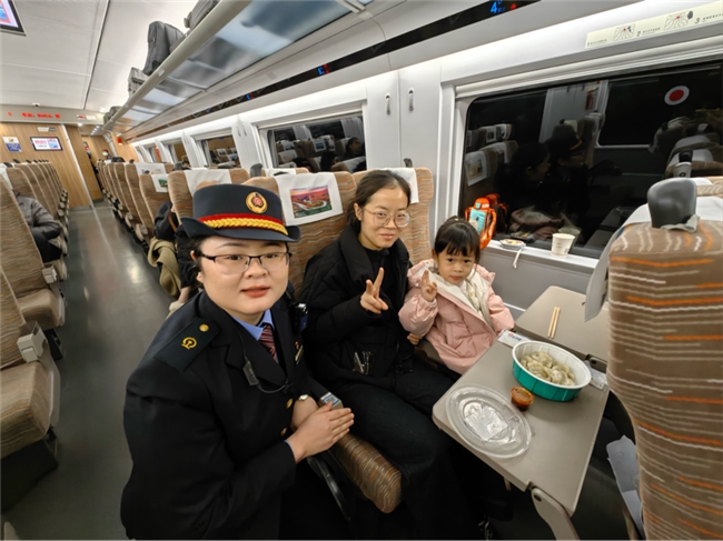 从协助旅客安放行李、引导入座,到途中主动送上热水、提醒到站时间,再到悉心照料晕车旅客、帮助儿童旅客找到家人,乘务员们用细致入微的服务,为旅客的出行保驾护航。一位带着孩子出行的旅客感动地说:“本来还担心带着孩子坐车不方便,没想到乘务员全程照顾得这么周到,这个冬至旅途太暖心了,在列车上吃饭了暖心的饺子!”
