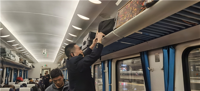乘务员李荣山正踮着脚尖,小心翼翼地为旅客将行李箱摆放到行李架的安全位置。从旅客上车到发车前的十几分钟里,这样的动作他要重复数十次。“行李架的空间有限,帮大家把行李摆整齐,既避免行车中掉落风险,也能给后面的旅客腾出更多空间。”李荣山的话语朴实,却道出了铁路一线服务的初心。