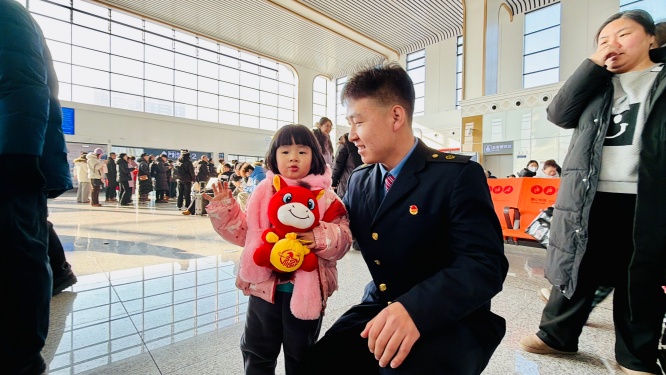 红彤彤的灯笼高高悬挂,亮闪闪的中国结串起出行暖意,鲜艳的花束和多彩的窗贴更是让浓郁的年味扑面而来——抚顺站早早换上了“新春盛装”,处处洋溢着喜庆祥和的气氛。上午9时,候车室内骤然响起动感旋律,身着制服的铁路志愿者们踏着舞步穿行在候车座椅间,快闪舞蹈《旗开得胜》《铭记》的欢快节奏瞬间点燃全场。舞蹈尾声,志愿者们齐声送上“春运平安,阖家幸福”的真诚祝福,获得旅客阵阵掌声。