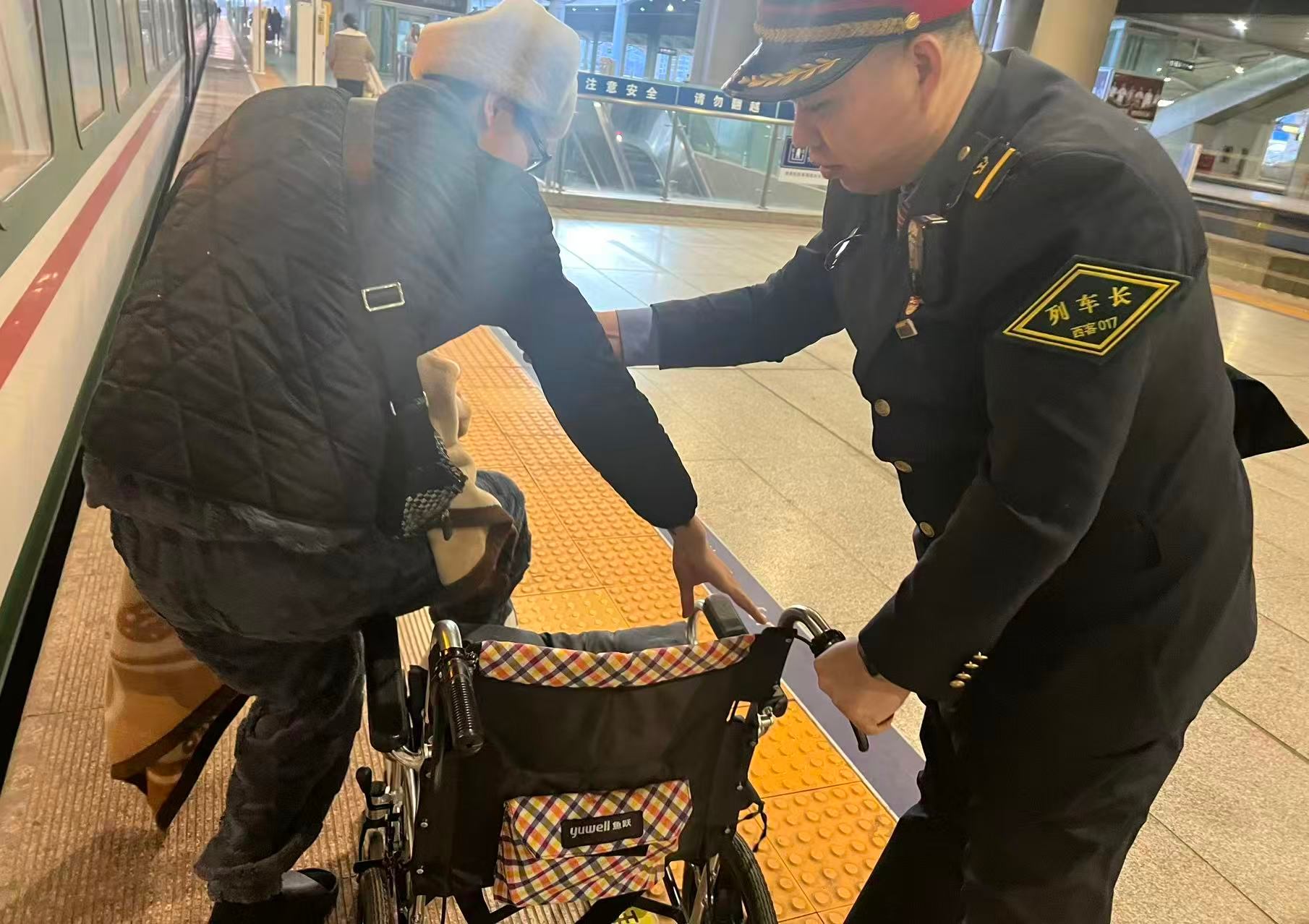 抵达后,刘直小心搀扶、平稳护送旅客安全下车,与车站工作人员完成无缝衔接,确保旅客出站顺畅。旅客及同行家属深受感动,对列车长一路贴心照顾连连称赞,特意通过口头表扬、现场致谢等方式,为铁路工作人员的暖心服务点赞。