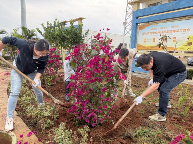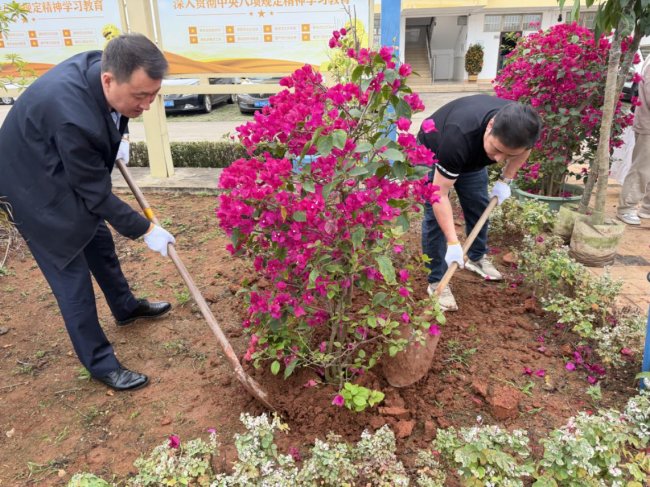 上午9时,铁锹与锄头碰撞出欢快的节奏,党、团青年们热情高涨、干劲十足,大家三两成组、分工协作:有的扶苗填坑,有的提水浇灌,每一个环节都一丝不苟。现场欢声笑语不断,劳动的汗水与喜悦的笑容交织在一起,勾勒出一幅生动的春日劳作图景。经过两个多小时的辛勤忙碌,新栽下的三角梅树苗整齐排列,在春风中摇曳生姿,增添了一抹盎然生机。