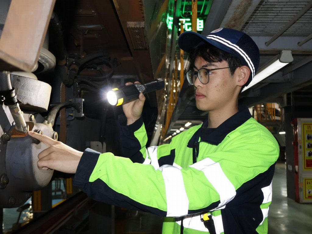 另一边,潘梓帆正在检查车底外部挂件,猫着腰用手电筒仔细查看挂件螺丝是否松动,发现稍有不达标的问题,立即进行整治。