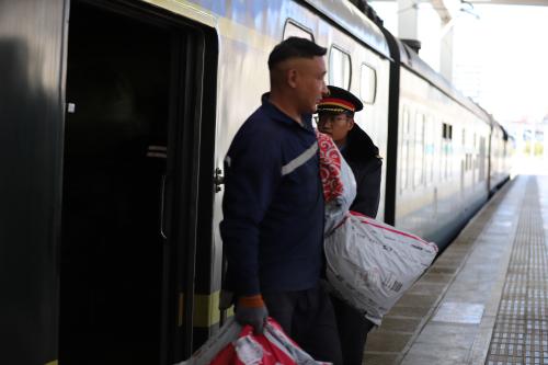针对“双11”期间到达货物量激增的实际,行包班组迅速组织卸车骨干力量,全面推行“随到、随卸、随拣、随取”作业机制。搬运过程中坚持“轻拿轻放”,装运环节做到“正向摆放、有序清点、重点交接”,最大限度降低货损风险。客运车间依托列车到站终端系统,实时掌握列车动态及站台变更信息,实现“即到、即卸、即装、即运”,让快件在站内停留时间压缩至最短,跑出高原物流“加速度”。