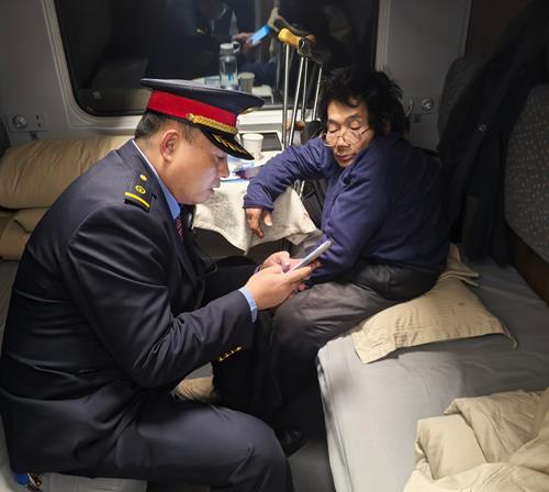 列车飞驰,乘务人员的心始终牵挂着这位特殊旅客。途中,他们多次主动来到旅客身边,细心询问身体状况与需求,及时递上热水,提供细致入微的关怀。专业高效的服务流程,叠加发自内心的热忱,共同为旅客营造了安心、舒心的乘车环境。