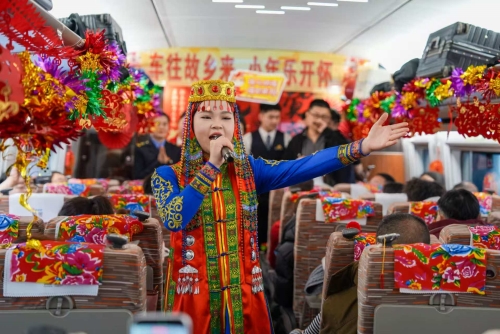 车厢里,精彩轮番上演,暖意持续升腾。开场舞蹈《卡拉永远OK》尽显铁路青年的昂扬风采,瞬间点燃现场氛围;王诗涵演唱的《恭喜发财》,用熟悉的旋律送上新春美好期许。6名乘务员身着特色大花马甲,带来活力四射的歌伴舞《火辣辣》,将东北人的豪爽热情展现得淋漓尽致,引得旅客掌声连连。