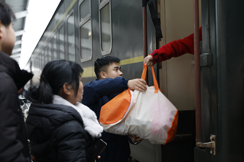 随着春运返乡客流持续攀升,K4288次列车成为繁忙的“流动驿站”。“车厢里连过道都站满了人,必须侧身挤过,有时甚至要从旅客的行李间隙穿行,”许郅轩坦言,“泡面味混杂着汗味充斥在整个车厢。”这样的工作环境,比他想象中更具挑战,他平日里习惯了与钢轨、机械为伴,如今转身成为乘务员,既要快速适应岗位转变,更要应对高强度的服务工作。