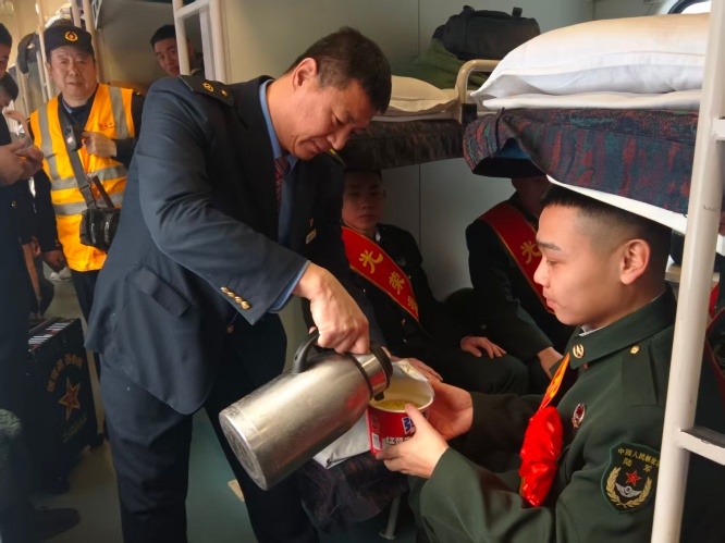 考虑到老兵们晚间未进食晚餐,列车发车后,列车员第一时间为全体老兵送上开水,在严寒旅途中送去温暖与关怀。