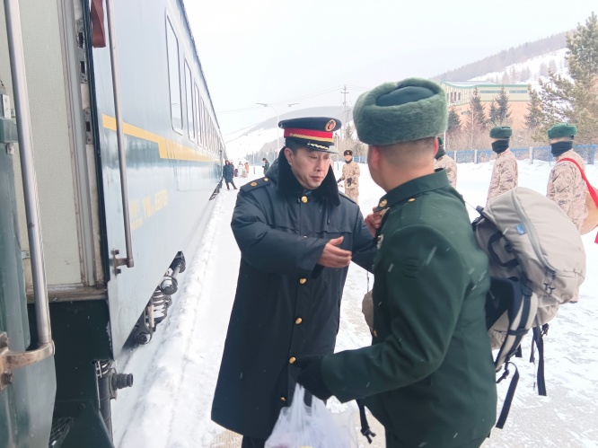 当时的阿尔山站台被厚厚的白雪覆盖,北风夹着雪花打到脸上特别疼,为了让“老兵”尽快乘车,乘务人员在添乘干部车队长安云辉的带领下,提前40分钟到站出场,在站台上有序等候、热情迎接,主动帮扶老兵顺利登乘。