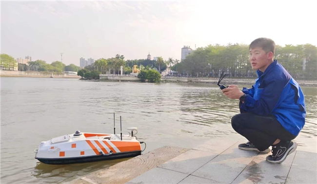 晚上回到驻地,他便将测得的数据导入电脑绘图。从地块测量到测绘图纸修改,从参与征地工作到向群众普及政策,他都积极参与、细心观察、认真学习。即便工作繁忙,他也不忘为自己“充电”:面对沉管安装区(东莞水道)复杂的水下地形核查需求,项目采用无人船搭载高精度多波束测深系统的前沿技术方案。这艘集成高分辨率地形测绘、实时三维成像与高效数据采集功能的无人船,大幅提升了作业精度与工程效率。为快速掌握此项关键技术,他主动对接顺德项目经验丰富的测量团队,系统学习无人船航控、多波束参数配置与点云数据处理等核心技术环节。为获取全线正射影像图,他钻研无人机测绘技术,拍摄、解析影像并对比不同时段地形,绘制各时期施工难点。遇到复杂地形,他反复调整飞行参数,甚至冒雨补拍,只为得到最清晰准确的影像资料。通过深入研究无人机测绘数据,不仅能为前期施工准备、道路导改、管线改迁等工作提供参考,还为后续工程进度管理提供了直观的可视化依据,让原本抽象的设计图纸变成可实时监测的动态版图。