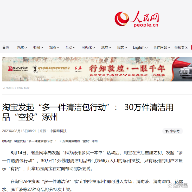 8月14日,淘宝天猫联合全棉时代、安鲨、滴露、威露士等20家爱心企业共同发起#多一件清洁包 公益活动, 30万件1分钱的清洁用品专为涿州投放,免费提供价值近千万元的商品,为涿州灾后消毒卫生工作筑起一道健康“屏障”。这是安鲨首次通过线上方式向C端用户捐赠,上千桶安鲨消毒液已逐步到达涿州,帮助灾区群众减少洪水后疾病传播的途径,助力生产生活秩序尽快恢复。