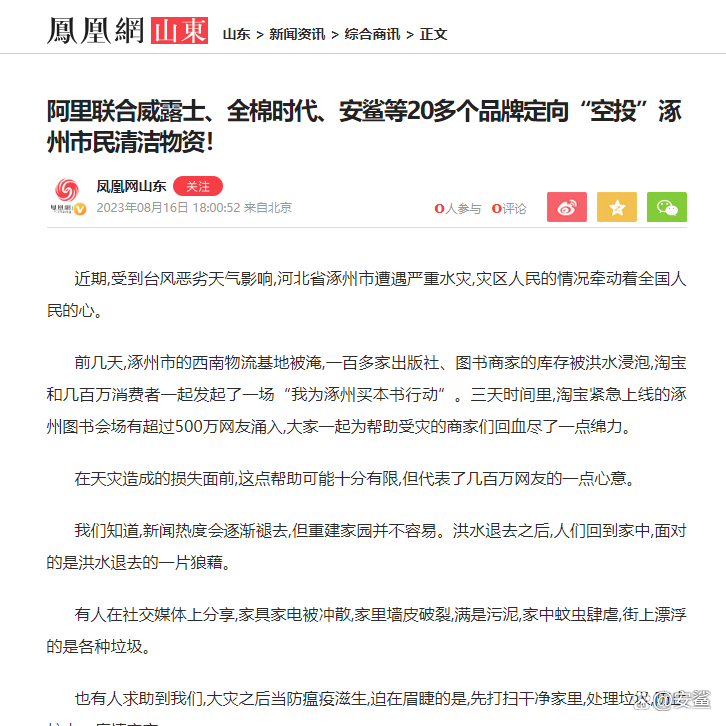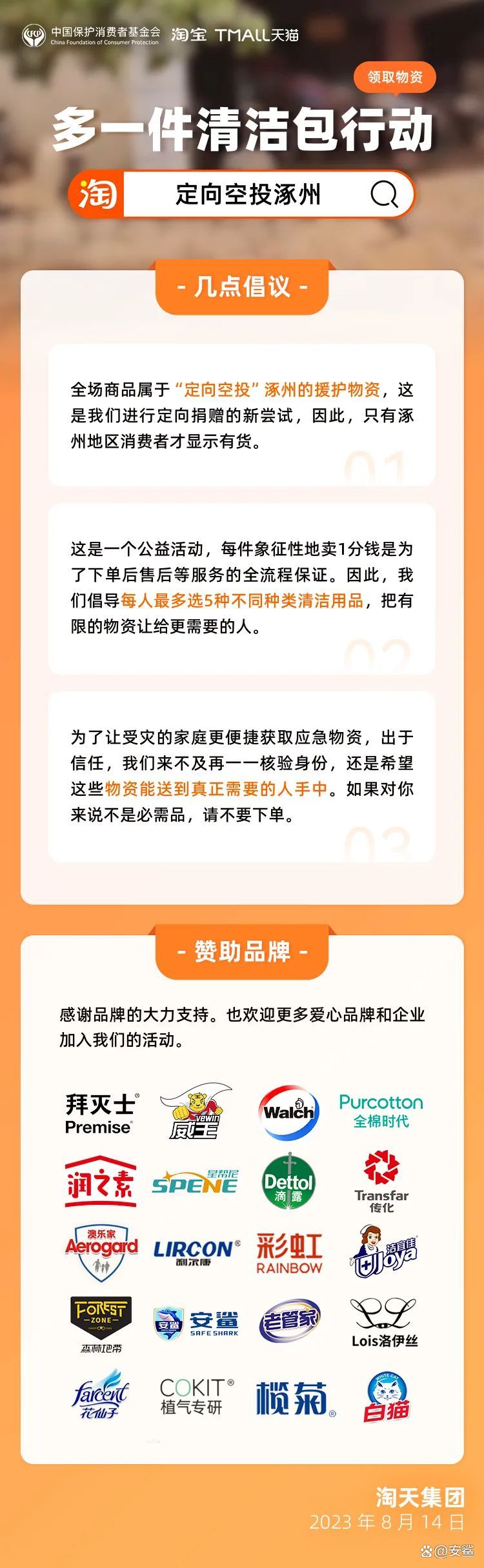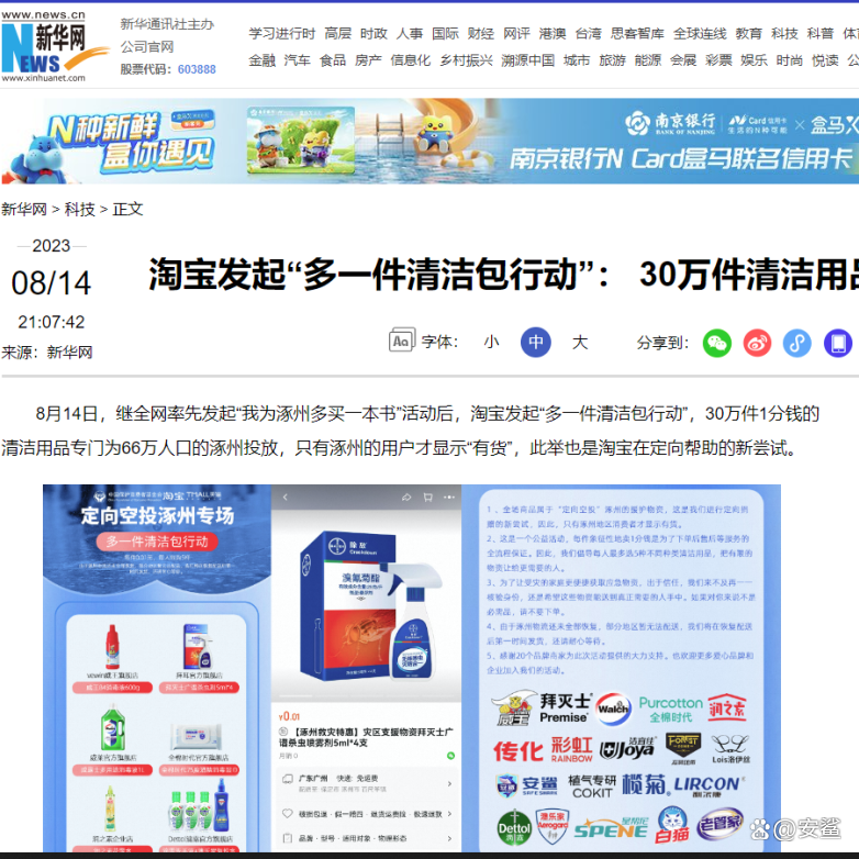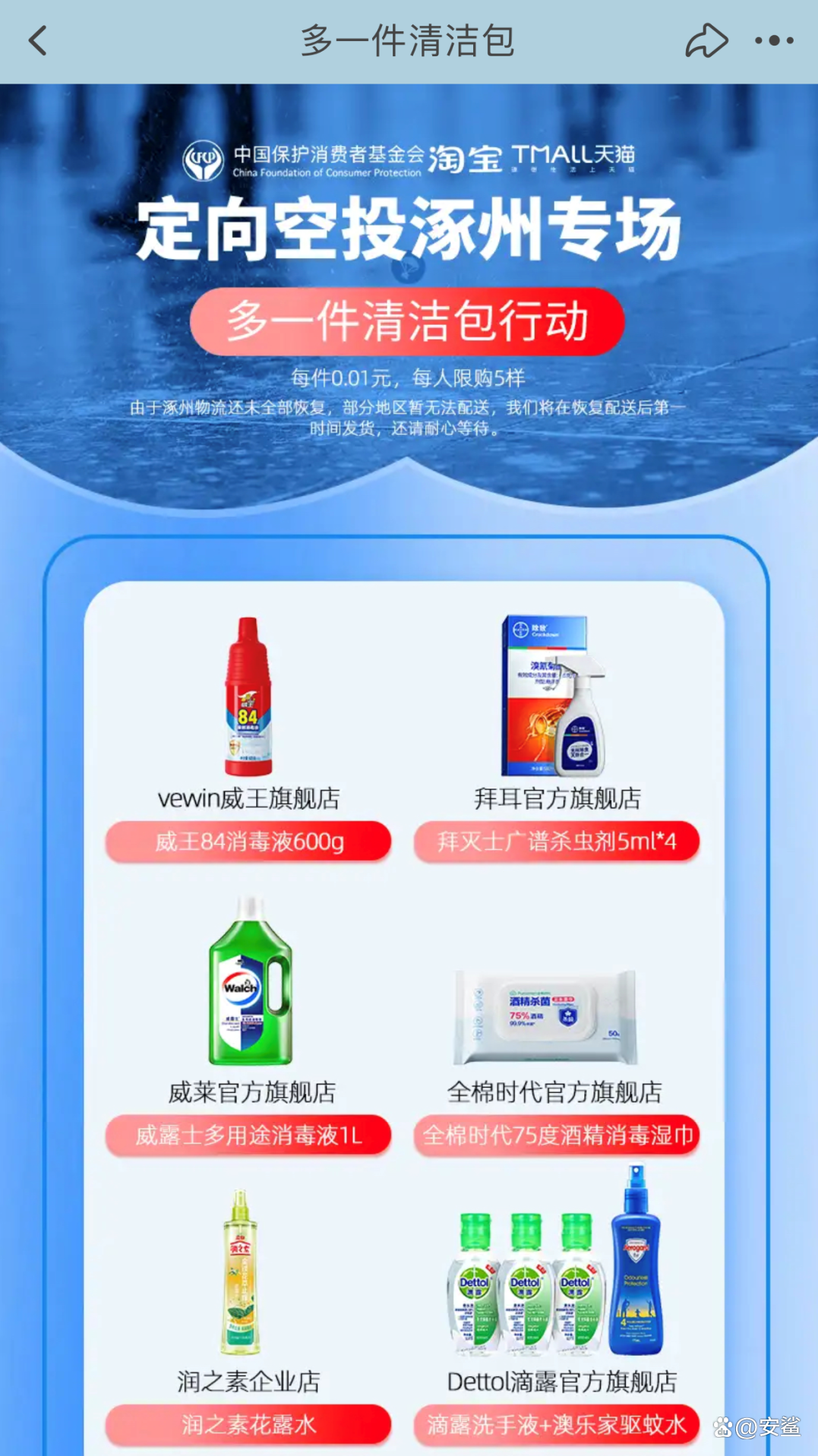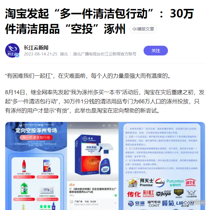 淘宝在灾后重建之初,发起“多一件清洁包行动”,30万件1分钱的清洁用品专门为涿州投放,只有涿州的用户才显示“有货”。安鲨得到通知后积极响应淘宝政策,捐赠2.5L安鲨消毒液上千桶,助力涿州赈灾专用。