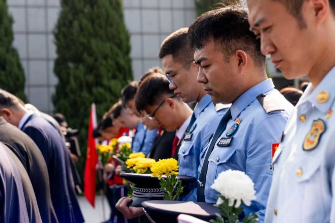 秋日的烈士陵园松柏苍翠、庄严静穆。9 时 20 分,敬献花篮仪式正式开始,礼兵手持花篮入场,分站纪念碑两侧,全体人员齐唱《中华人民共和国国歌》。随后,大家静静伫立在革命烈士纪念碑前,垂首默哀,向革命先烈致以最深切的哀思。