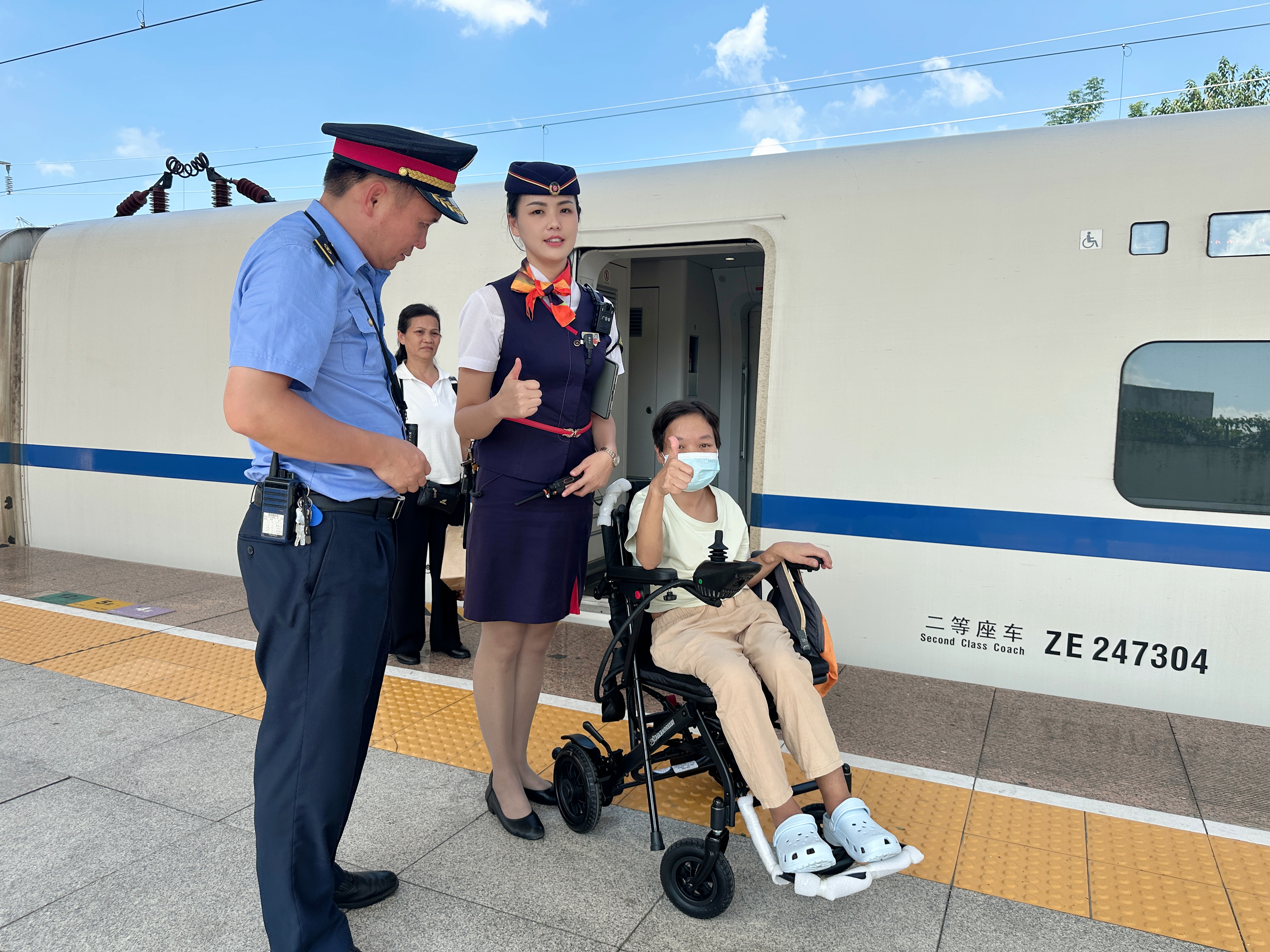 当日,列车长周洁在昆明南站台组织乘降时,一眼发现了独自乘坐轮椅的李女士。得知其因重症需长期透析导致无法行走,且未提前预约服务,周洁立刻上前搀扶轮椅,轻声安抚:“您别担心,有我们在。”一句暖心慰藉,瞬间消解了李女士的局促——这是她践行“爱心服务”的第一步,也是广州客运段“以旅客为中心”的直接体现。