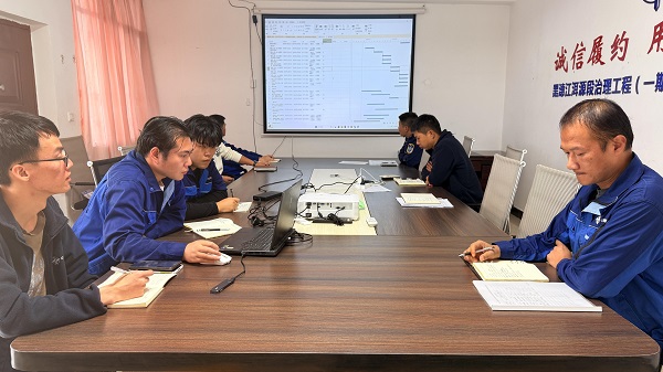 在项目部会议室,工程技术人员针对施工进度计划和技术难点进行了深入的探讨。大屏幕上清晰地展示了施工进度表,各节点任务一目了然。同时,项目管理人员深入到施工现场,与施工人员就河道治理、堤防建设等施工细节进行了详细的技术交底,确保施工质量和安全。