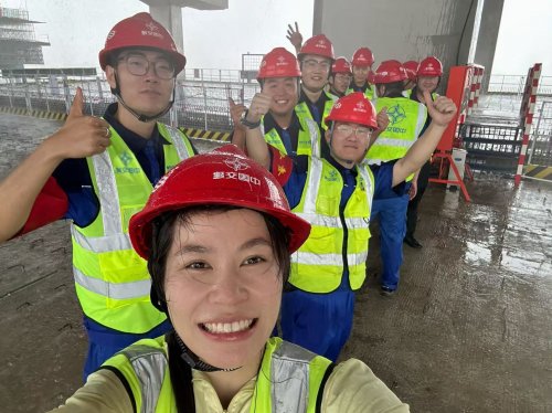 朝阳的光刚撒在现场,骤雨忽至,豆大的雨点砸下来,转瞬就把大家淋成了落汤鸡。镜头里,安全帽上的水珠顺着帽檐成串滴落,工装紧紧贴在身上,但青年们没有四散躲避——技术员张雨坤攥着台词对镜头讲解,一航局五公司狮子洋项目部安全员黄林飞演示应急设备操作,动作依旧标准利落。