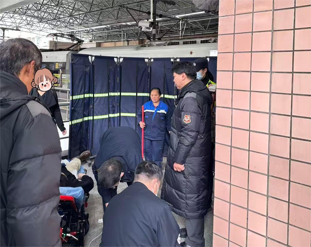 与此同时,值班站长朱海军和驻站民警接到报告后,火速赶往现场。朱站长蹲在乘客身旁,轻声询问乘客的身体状况,安抚她的情绪:“别害怕,我们都在这里。”民警则在一旁维持现场秩序,确保救援工作能够顺利进行。
