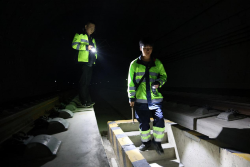 隧道上的照明设备在轨道延伸方向连成一条光带,光线由亮渐暗,最终融入黑暗。“全长9640米的隧道,其中有7551米为盾构段,每次隧道检查,都要走完全程,近两万步,耗时近三小时。”阳江北高铁路桥车间助理工程师姚作虎说。