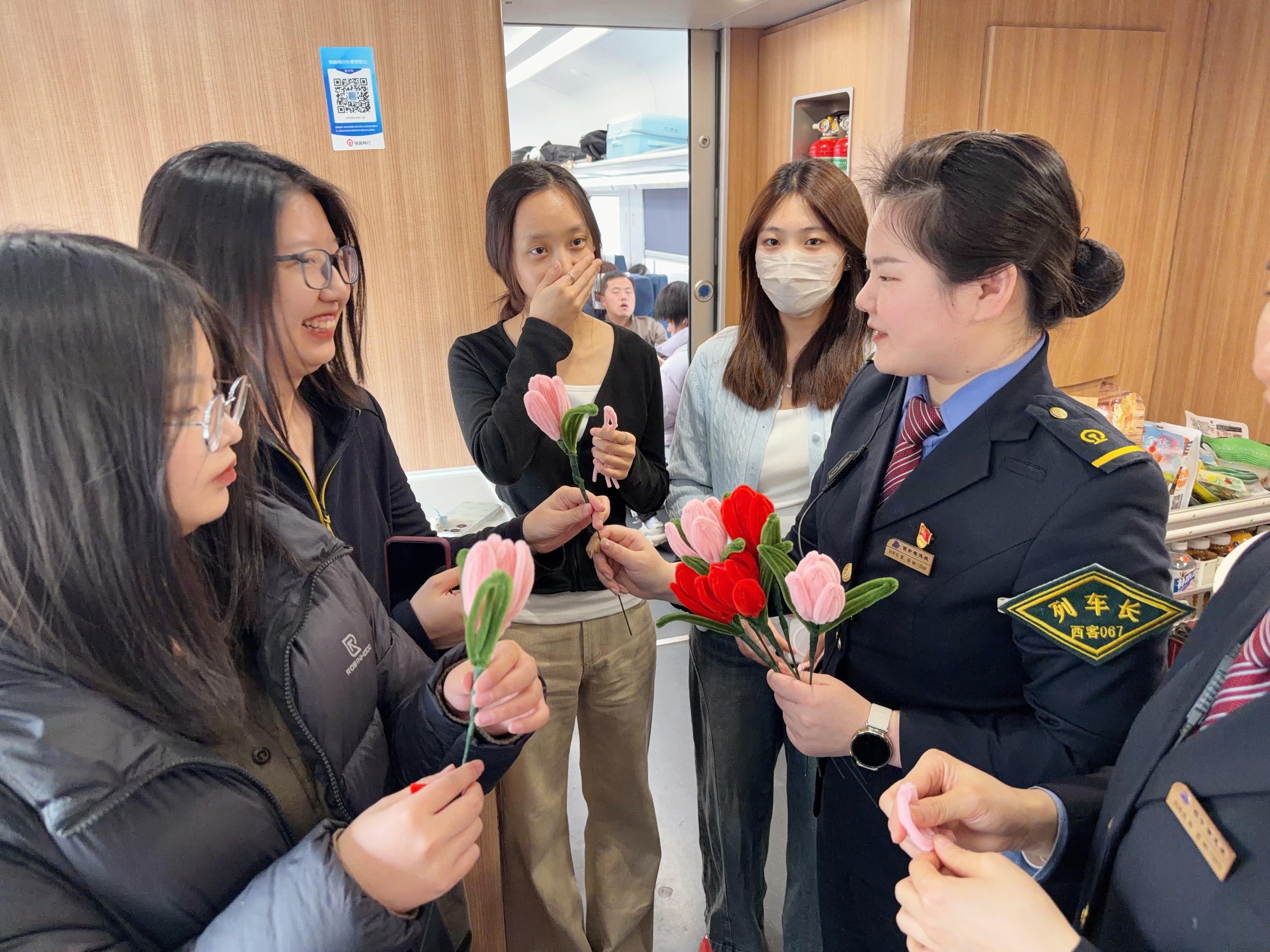 为了让奔波在旅途中的女性旅客感受到节日的关怀,列车长蔡蓉提前组织乘务员将彩纸、丝带等材料细心整理归类。活动开始后,蔡车长带领乘务员走进车厢,热情邀请女性旅客到餐车一起动手制作手工玫瑰。在蔡车长的带动下,简单的材料在大家手中化作一朵朵栩栩如生的玫瑰。餐车内欢声笑语不断,有的旅客巧手翻飞,有的在乘务员的指导下认真折叠,一朵朵纸折玫瑰逐渐成形。花瓣虽由纸折,心意却格外真挚。