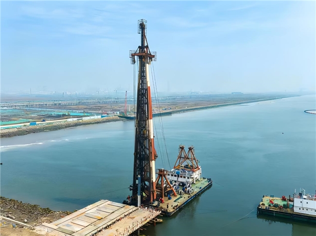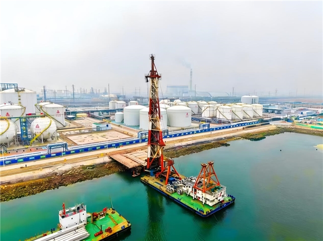 项目位于天津港大港港区西港池西南端岸线,紧邻已建一期码头西侧,将新建2个5万吨级泊位(1个液化烃泊位、1个油品及液体化工品泊位),码头总长611米,设计年吞吐量达300万吨,其中两泊位混凝土方桩水上沉桩共计553根,钢管桩水上沉桩共计120根。