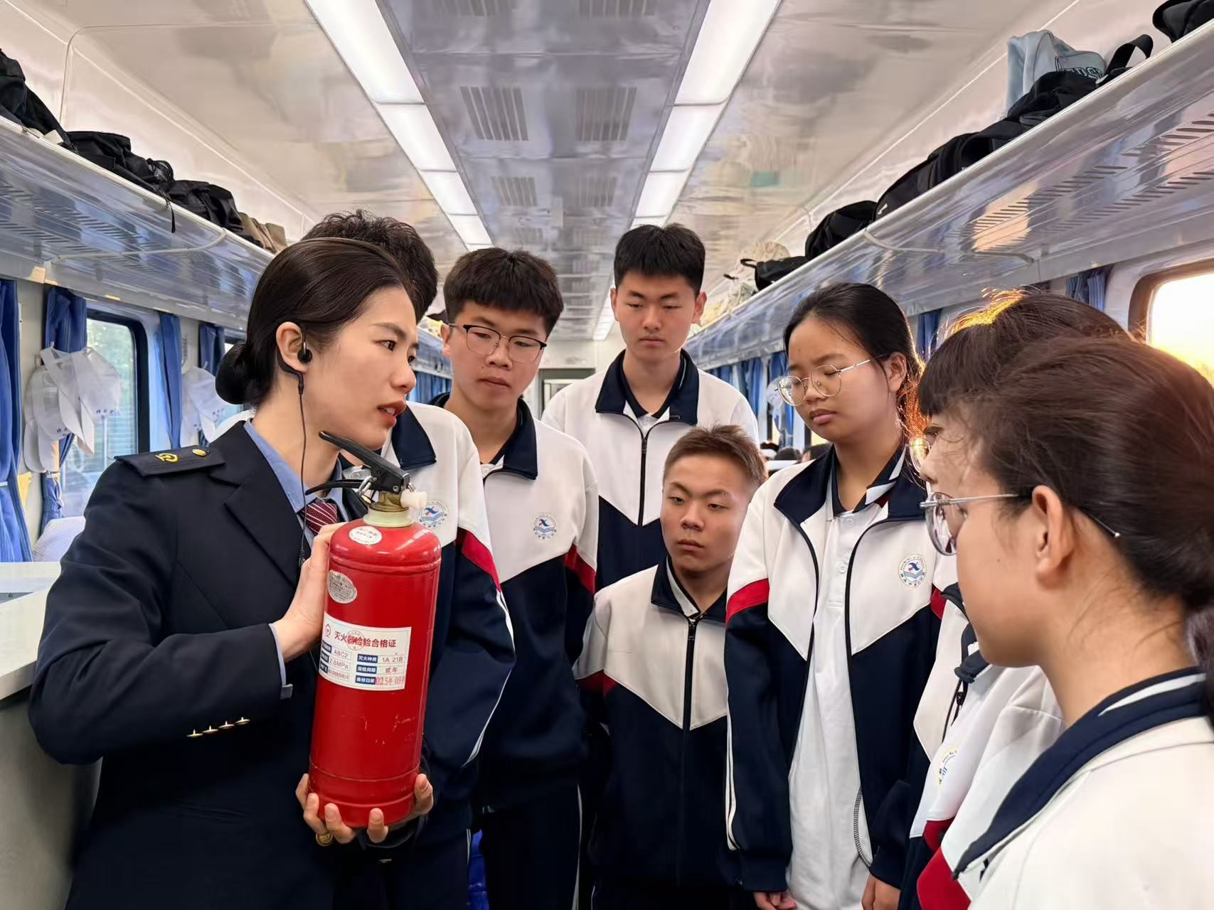 列车开行后,乘务人员化身安全宣讲员,面向研学学生开展沉浸式安全科普课堂,详细讲解列车各类基础设备设施功能用途,现场演示灭火器正确使用方法,通俗易懂普及消防安全、乘车规范、应急避险等核心安全注意事项。全程主动对接带队老师,耐心回应师生各类诉求,细致做好乘车引导与暖心帮扶服务,让研学旅途兼具安全性与教育性,切实以铁路责任担当,守护学子平安研学路。