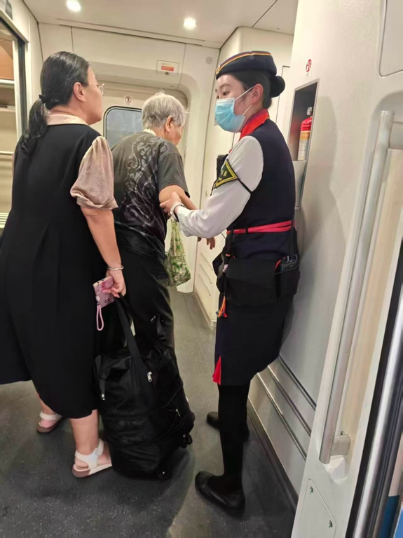列车运行途中,温思思多次主动来到王奶奶座位旁,俯身询问老人的身体状况,了解是否需要协助如厕、接水等服务,时刻关注老人的旅途状态,让王奶奶和家属倍感安心。
